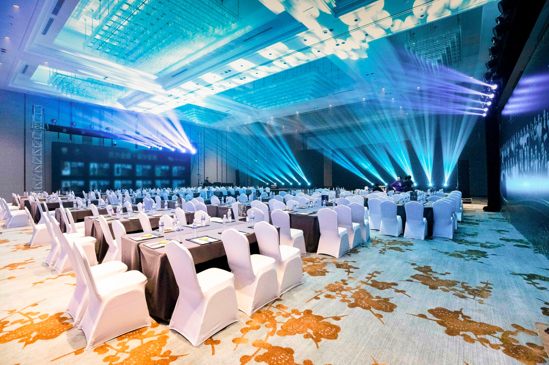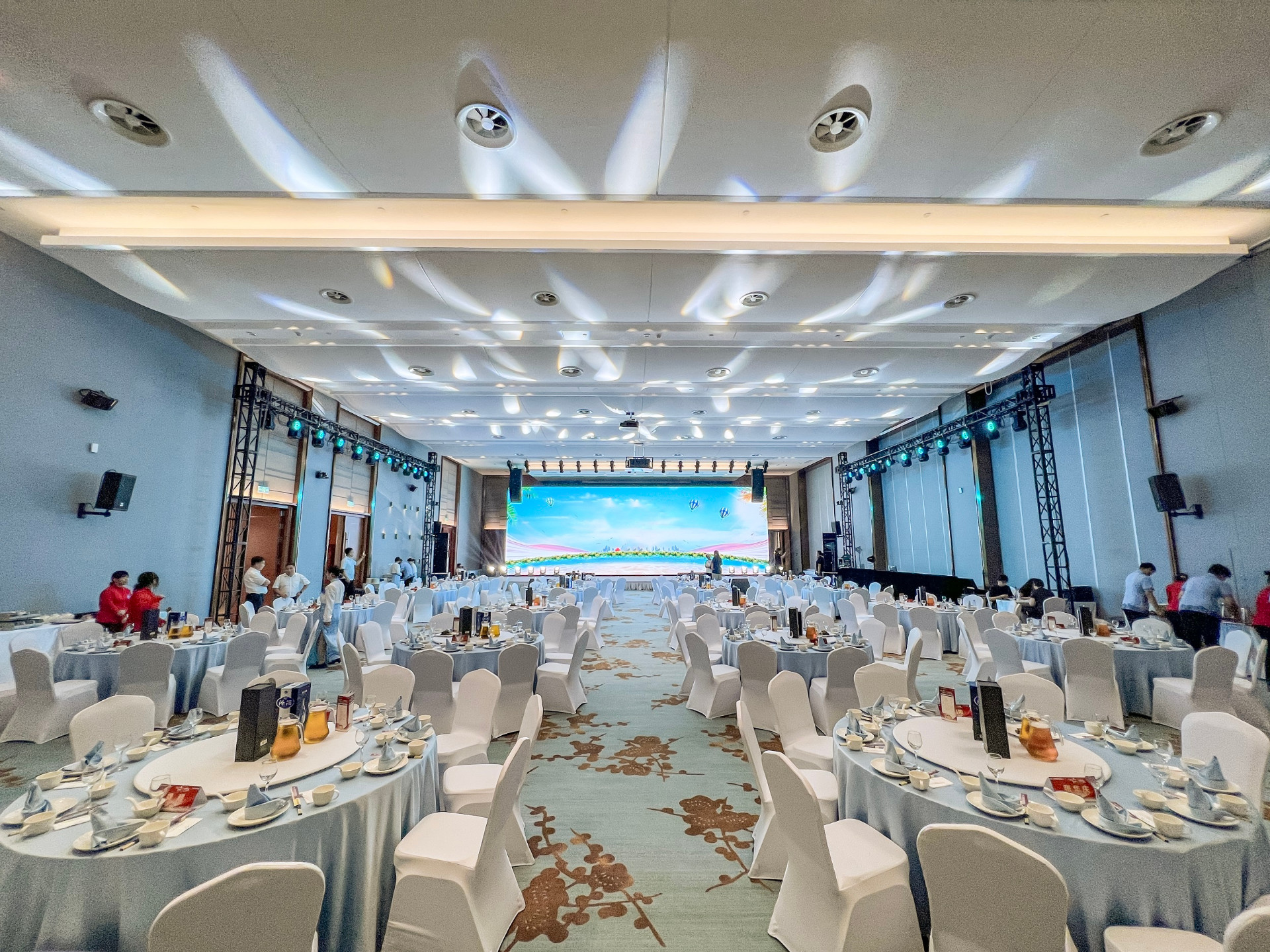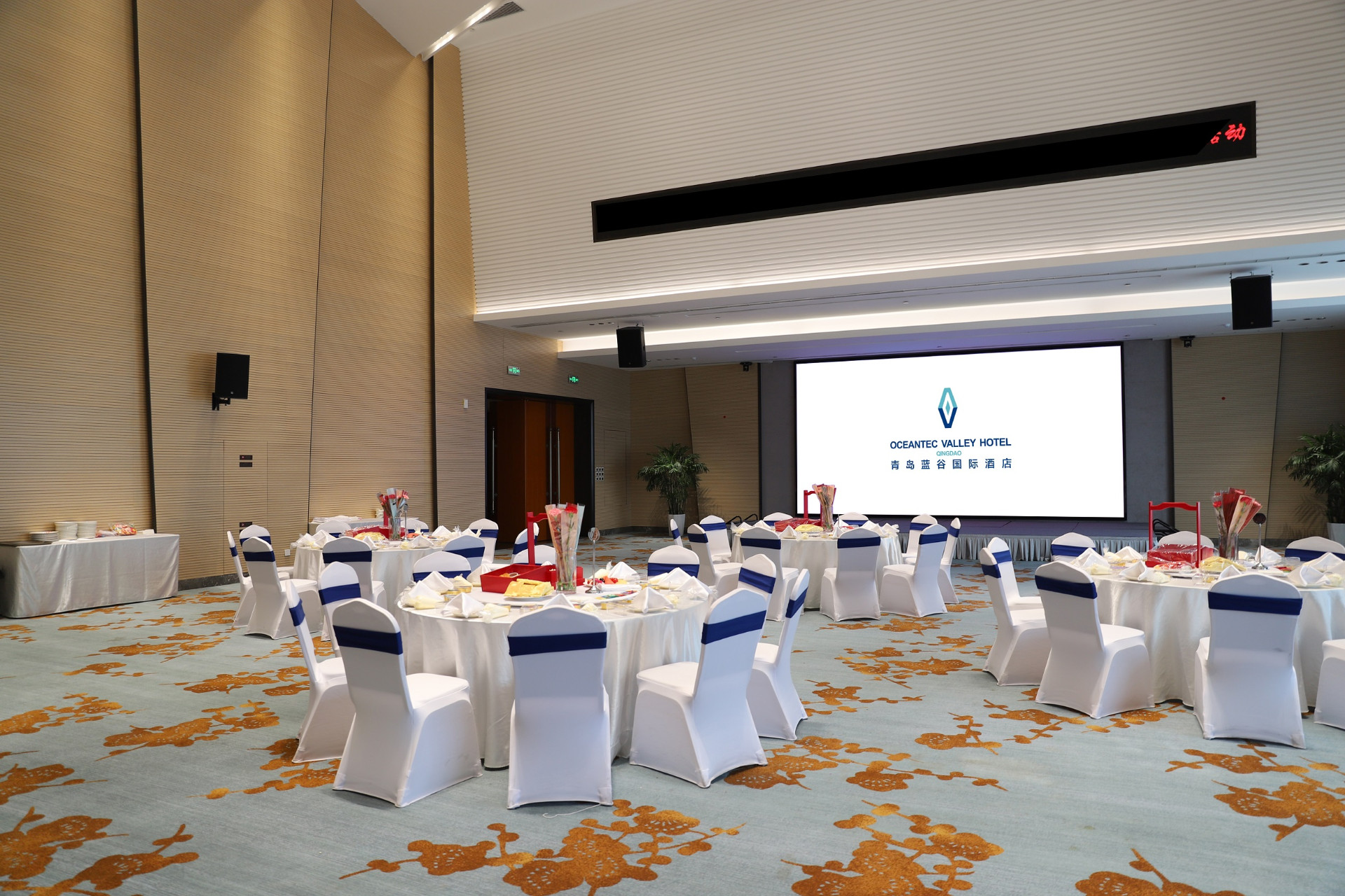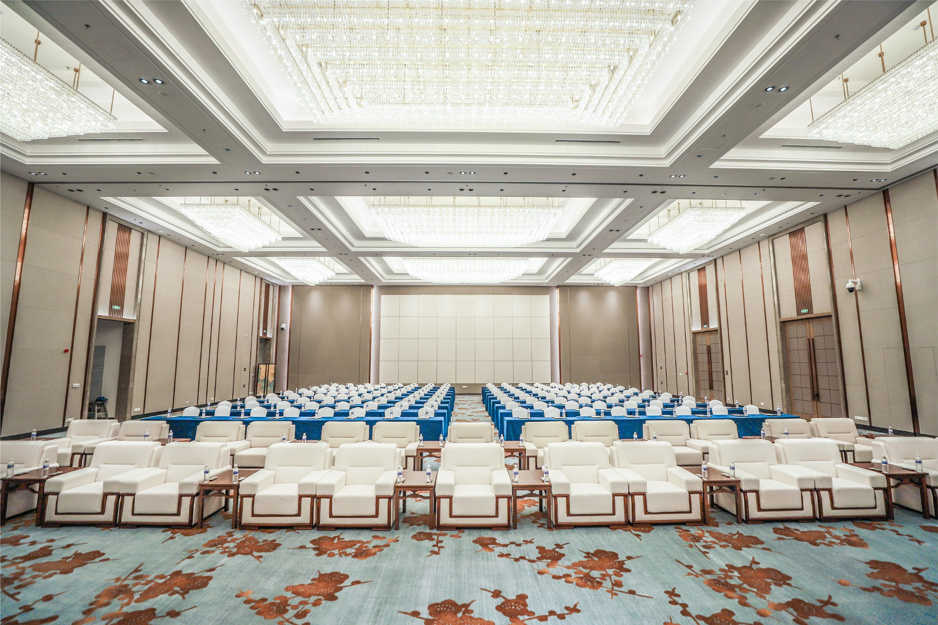 会议室空间:1200㎡无柱式宴会厅,层高6.5m,可拆分为两个大厅。容纳量:最多可容纳1200人,婚宴可容纳42桌,团餐可容纳55桌。配套:投影显示系统、扩